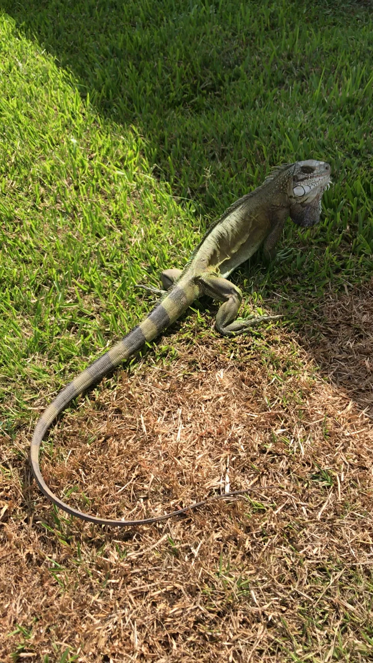 That wasn't going to work. The last thing I needed was for Lucille, my poodle, to find and bring that tail inside with her. So, then we had to look for the tail and throw it over the fence. At this point, the Iguana still wasn't moving and I was late for school pick up so away I went.